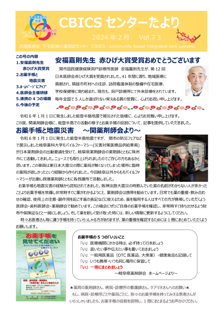 安福嘉則先生 赤ひげ大賞受賞 お薬手帳と地震災害、他
